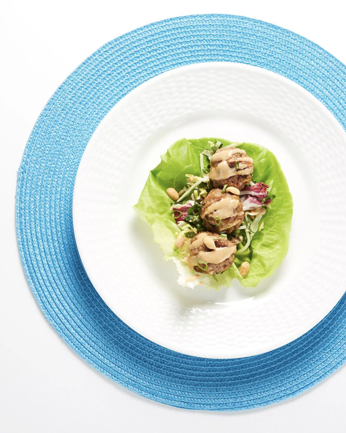 - To assemble, spoon a scoop of coleslaw into the bottom of each lettuce cup, top with 2 or 3 meatballs and drizzle with peanut sauce. Garnish with roasted peanuts and chopped green onions. Serve with remaining peanut sauce.